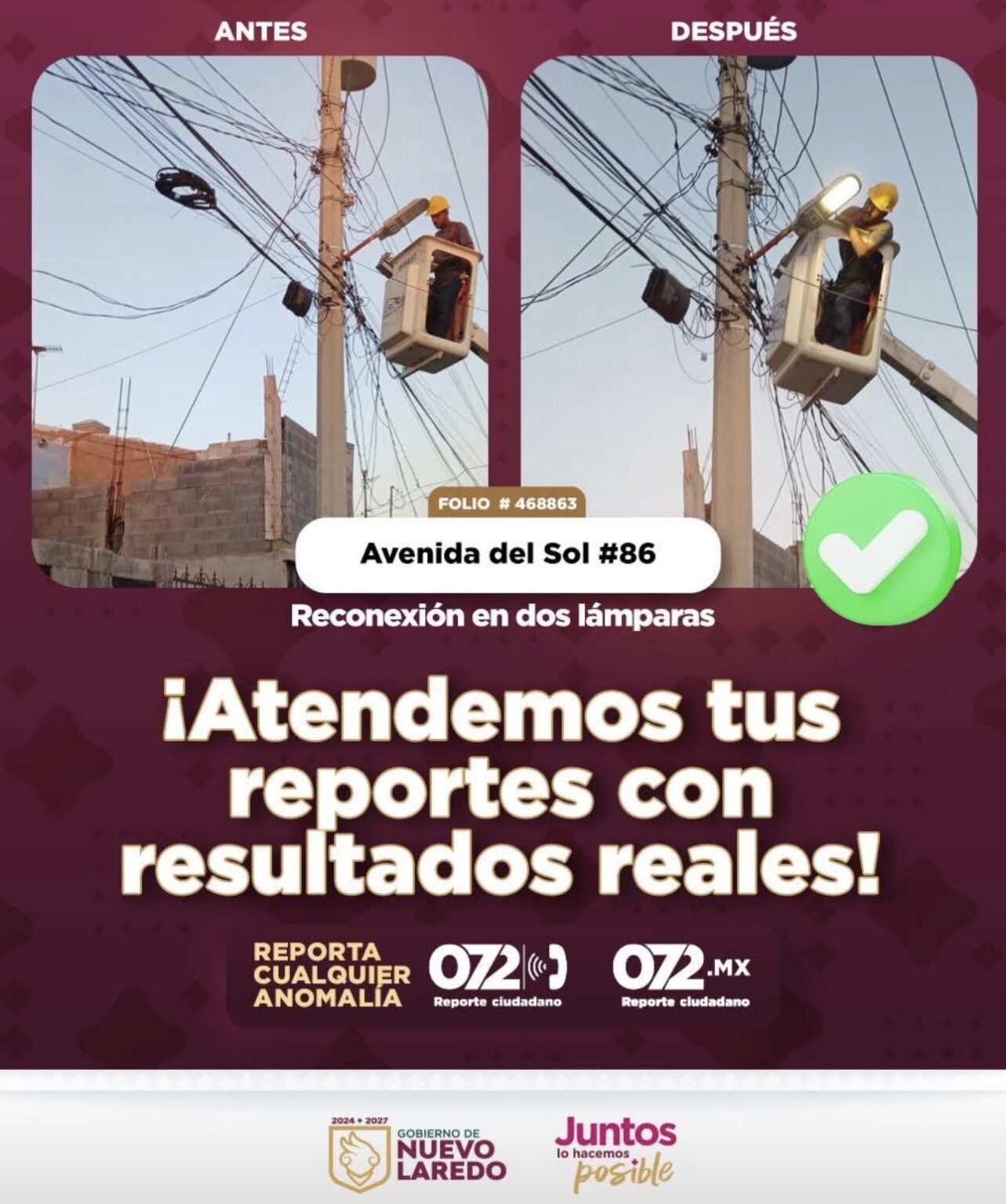 NUEVO LAREDO.- En atención a un reporte ciudadano, se realizó la reconexión de dos lámparas en Avenida del Sol #86, dando seguimiento puntual al folio #468863.